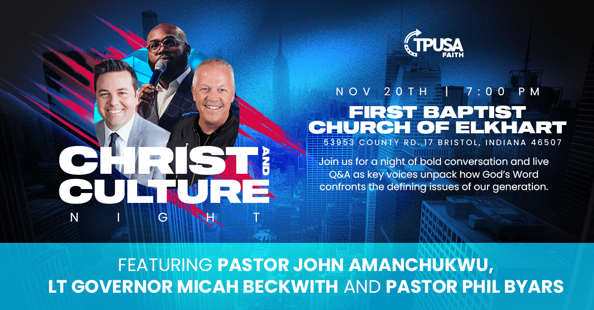 Join us for an evening of bold conversation featuring guest speakers who will unpack how God’s Word confronts the defining issues of our generation. Hosted in partnership with Turning Point USA Faith, this event brings together voices like TPUSA Faith Contributor John Amanchukwu, Lieutenant Governor Micah Beckwith, and our own Phil Byars for a powerful night of truth and perspective on faith and culture.